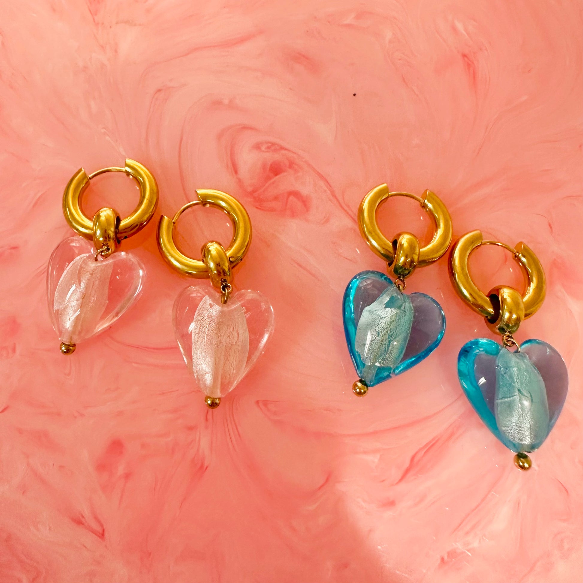- Blue hearts on a chunky brassy toned hoop earring
